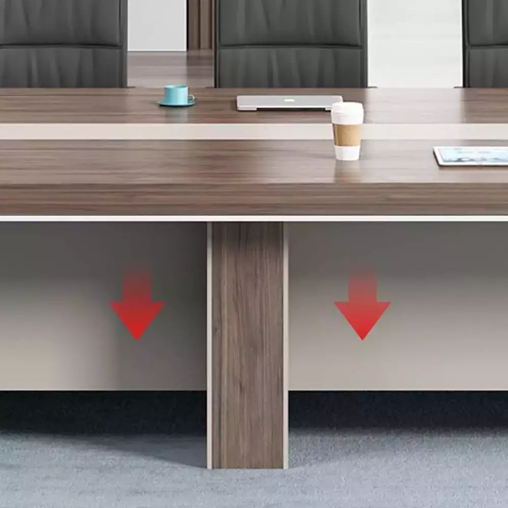 Pensando na praticidade do dia a dia corporativo, a mesa pode ser equipada com caixas de tomada embutidas, facilitando a conexão de notebooks, projetores e outros dispositivos eletrônicos. Além disso, os pés possuem sapatas deslizantes niveladoras, permitindo ajustes de altura para garantir estabilidade em diferentes tipos de piso.