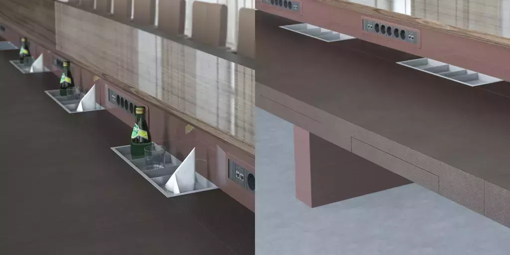 Pensando na praticidade do dia a dia corporativo, a mesa pode ser equipada com caixas de tomada embutidas, facilitando a conexão de notebooks, projetores e outros dispositivos eletrônicos. Além disso, os pés possuem sapatas deslizantes niveladoras, permitindo ajustes de altura para garantir estabilidade em diferentes tipos de piso.