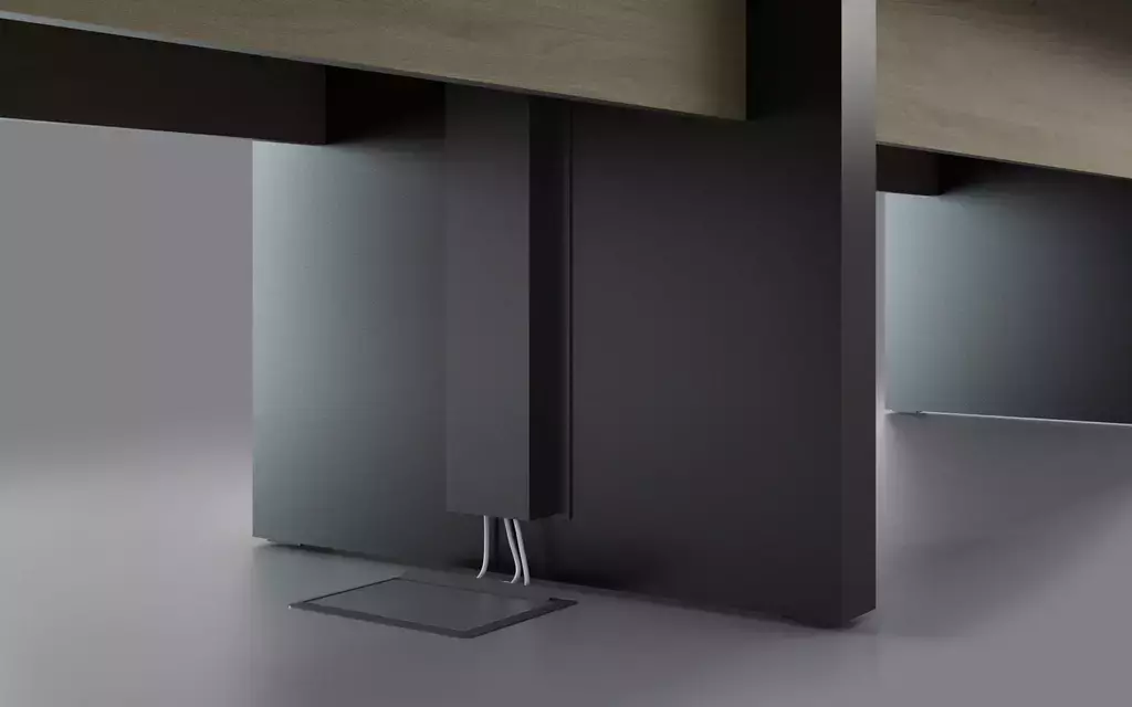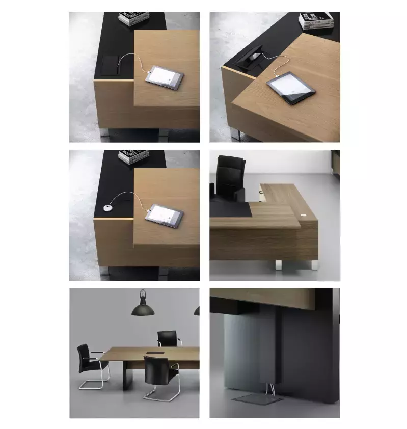 Pensando na praticidade do dia a dia corporativo, a mesa pode ser equipada com caixas de tomada embutidas, facilitando a conexão de notebooks, projetores e outros dispositivos eletrônicos. Além disso, os pés possuem sapatas deslizantes niveladoras, permitindo ajustes de altura para garantir estabilidade em diferentes tipos de piso.
